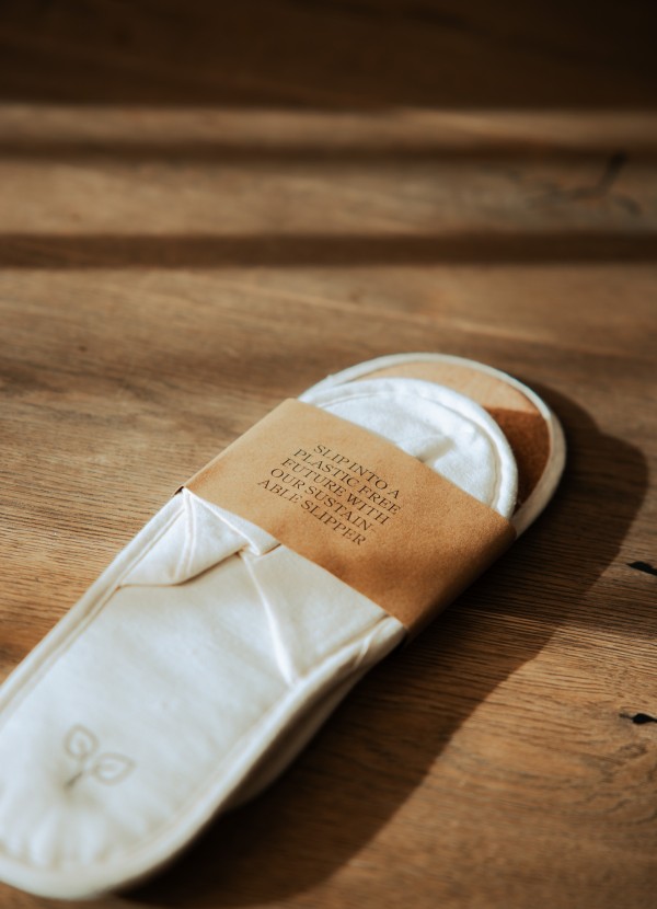 In Plastik verpackte Badeslipper waren uns schon lange ein Dorn im Auge. Diese haben wir nun endlich durch Slipper aus Leinen und mit Korksohle ersetzt. Zusätzlich animieren wir unsere Gäste, die Slipper mit nach Hause zu nehmen oder eigene Slipper mitzubringen.