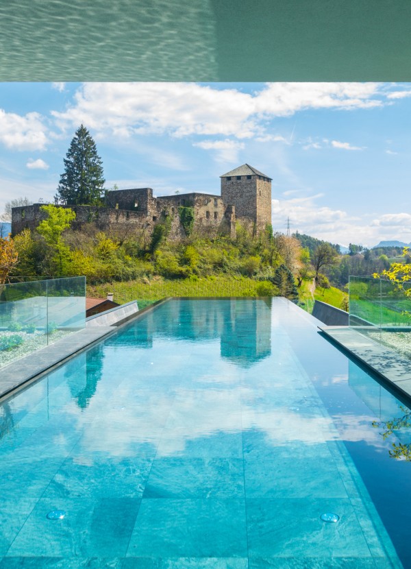 Discover the countless ways to immerse yourself in relaxation at the Waldhof². Dive into our expansive panoramic indoor pool (11x6m, 31°C), featuring a jet stream and direct access to both the garden and our tranquil wellness forest retreat. Float effortlessly in the panorama infinity pool (22m, 32°C, for guests 16+) under the picturesque ruins of Mayenburg Castle – or refresh yourself in the outdoor pool.